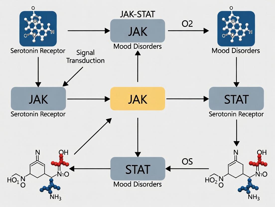 The 5-HT1A and 5-HT2A receptors are G-protein coupled receptors (GPCRs) critical for mood regulation. Recent studies demonstrate that activated STAT transcription factors, particularly STAT3 and STAT1, can directly regulate the expression of these serotonin receptors. Furthermore, JAK-STAT activation by pro-inflammatory cytokines (e.g., IL-6, IFN-α) can phosphorylate GPCR-associated kinases, altering receptor desensitization and membrane localization.