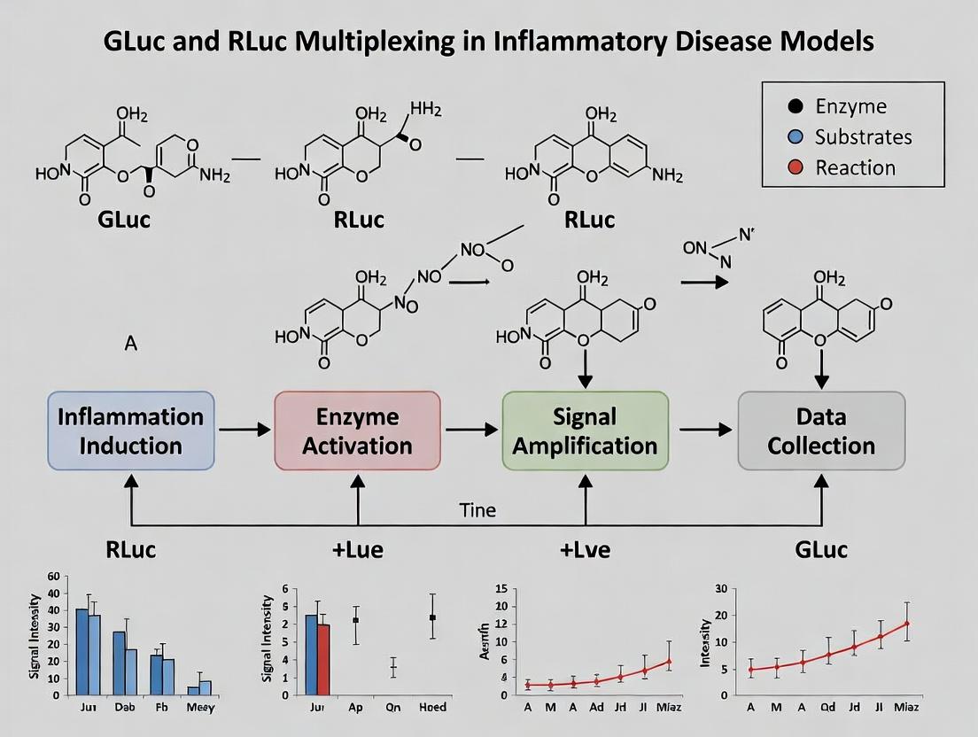 The strategic multiplexing of GLuc and RLuc luciferases provides an unparalleled, non-invasive window into the dynamic and multicellular processes of inflammatory diseases. By enabling the simultaneous, quantitative tracking of two distinct biological events—from immune cell recruitment and specific pathway activation to therapeutic response and off-target effects—this methodology moves research beyond single endpoints. Successful implementation, as detailed across foundational principles, robust protocols, diligent troubleshooting, and rigorous validation, empowers researchers to deconstruct disease complexity with greater precision. This accelerates mechanistic discovery, improves the predictive power of preclinical models, and ultimately fosters the development of more targeted and effective anti-inflammatory therapies. Future directions will likely involve engineering enhanced luciferase variants with further improved spectral separation and stability, and integrating this multiplexed bioluminescent approach with other modalities like PET or MRI for multi-parametric imaging.